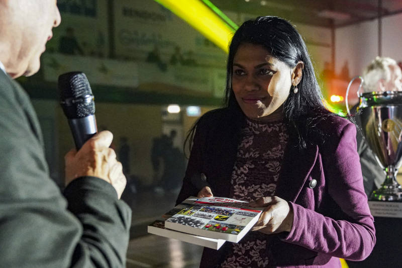 Riet Coeland, weduwe van de vermaarde Haagse korfbalverslaggever Jos Coeland, ontving uit handen van auteur Ton van Rijswijk een eerste exemplaar van het boek, waarin o.a. een hoofdstuk over haar man staat.